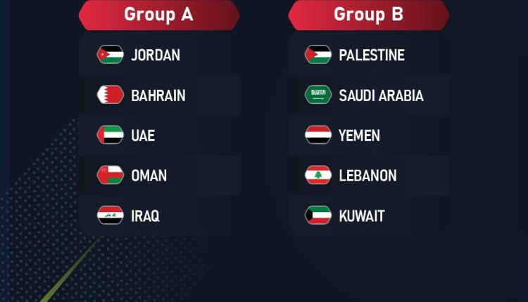 وبالمقابل، وزعت المنتخبات المشاركة في بطولة الذكور على مجموعتين، ضمت الأولى: الأردن والبحرين والإمارات وعُمان والعراق، فيما جاء بالمجموعة الثانية منتخبات: فلسطين والسعودية واليمن ولبنان والكويت.
