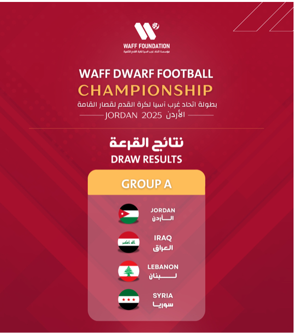 ولبنان وسوريا بالنسخة الأولى من بطولة اتحاد غرب آسيا لكرة القدم لقصار القامة،التي تقام في الأردن من ٢٤ إلى ٢٧ تشرين الأول/ أكتوبر ٢٠٢٥.