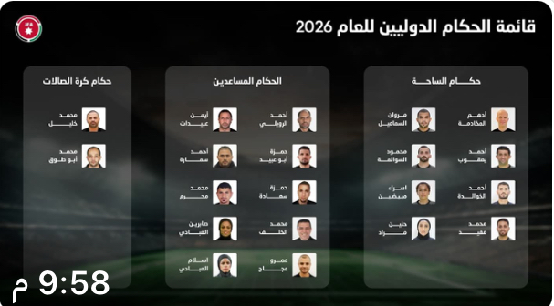 اعلن الاتحاد الأردني لكرة القدم قائمة الحكام الدوليين للعام 2026 بعد ان تماعتمادها من قبل الاتحاد الدولي لكرة القدم “فيفا”.
