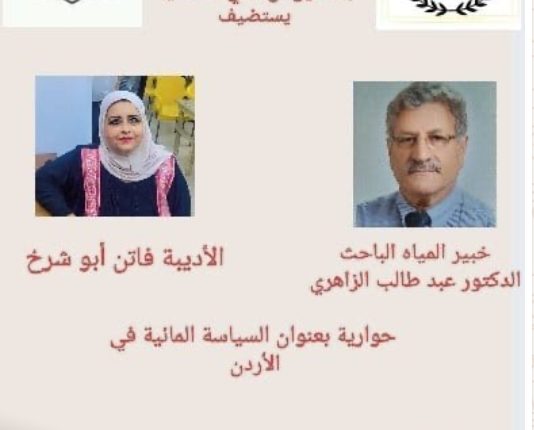 ويتحدث في الحوارية خبير المياه الباحث د.عبد طالب الزاهري والأديبة فاتن ابو شرخ، بحسب رئيس النادي هاني السفاريني.