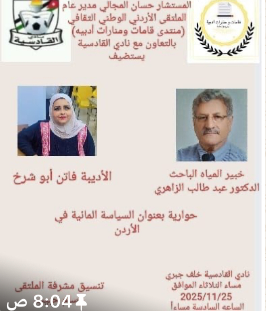 العقبة الإخباري – ينظم نادي القادسية بالتعاون مع منتدى الملتقى الوطني الثقافي عند السادسة مساء الثلاثاء ٢٠٢٥/١١/٢٥ حوارية عن السياسة المائية في الأردن وذلك في مقره بمنطقة ( الجاردنز).