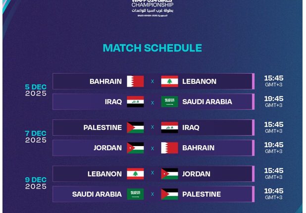 وتتواصل المباريات يوم 7 ديسمبر بمواجهتي فلسطين والعراق، ثم الأردن والبحرين، فيما يُختتم الدور الأول يوم 9 ديسمبر بلقاء لبنان والأردن، ومباراة السعودية وفلسطين.