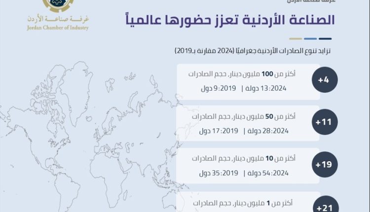 وأظهرت البيانات أن إجمالي عدد الدول التي صدر إليها الأردن منتجاته خلال العام الماضي بلغ 147 دولة وهو الرقم الأكثر خلال العقد الأخير، ما يؤكد تراجع التركز الجغرافي للصادرات الصناعية وتعزيز حضور المملكة في أسواق متعددة.
