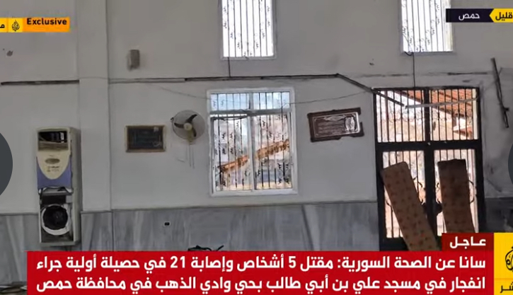 العقبة الإخباري أفاد مسؤول محلي سوري، بمقتل ثلاثة أشخاص وإصابة خمسة آخرين، جراء انفجار استهدف مسجداً في حي ذي غالبية علوية بمحافظة حمص وسط سوريا، يوم الجمعة، بحسب وكالة رويتر