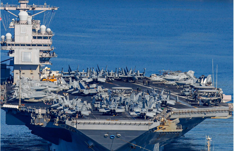حشدت الولايات المتحدة الأميركية قوة بحرية ضخمة في المنطقة. ونشرت أكثر مناثنتي عشرة قطعة بحرية أميركية في الشرق الأوسط، بينها حاملة الطائرات «أبراهاملنكولن» العاملة في بحر العرب، إلى جانب تسع مدمرات وثلاث سفن قتالية ساحلية. وفي خطوة نادرة، تموضعت أيضاً أكبر حاملة طائرات في العالم «جيرالد فورد» فيشرق المتوسط مع مدمرات إضافية، ورُصدت الحاملة الخميس في خليج سودا بجزيرةكريت، حيث تزوّدت بالإمدادات والذخائر، قبل أن تغادر باتّجاه ميناء حيفا.