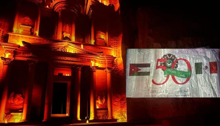 أضاءت سلطة إقليم البترا التنموي السياحي واجهة الخزنة الأثرية بألوان العلم المكسيكي، احتفاءً بالذكرى الخمسين لإقامة العلاقات الدبلوماسية بين الأردن والمكسيك.