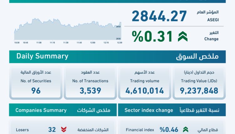 اغلقت بورصة عمان، اليوم الخميس، تداولاتها على انخفاض نسبته 0.03 بالمئة الى مستوى 2843 نقطة.