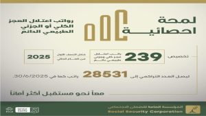 أعلنت المؤسسة العامة للضمان الاجتماعي، الأربعاء، عن تخصيصها 239 راتب اعتلال عجز كلي وجزئي طبيعي دائم خلال النصف الأول من العام الحالي، ليصل العدد التراكمي إلى 28531 راتبا كما في 30 حزيران 2025.