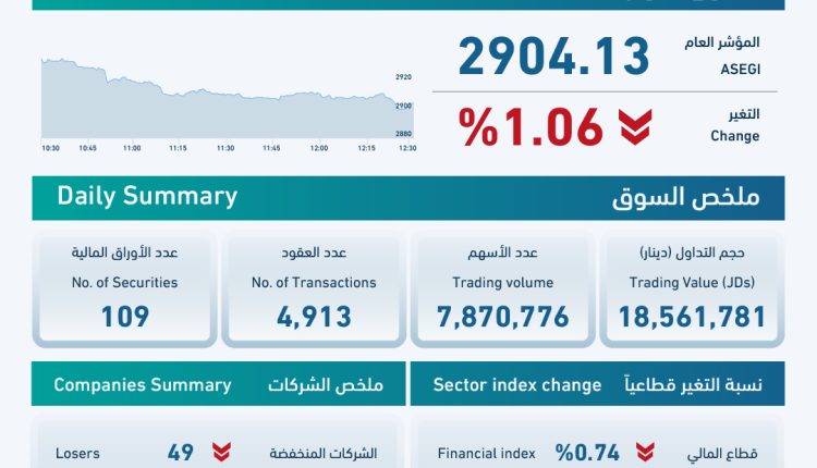 وانخفض الرقم القياسي العام لأسعار الأسهم لإغلاق هذا اليوم إلى 2904 نقطة بانخفاض نسبته 1.06 بالمئة.