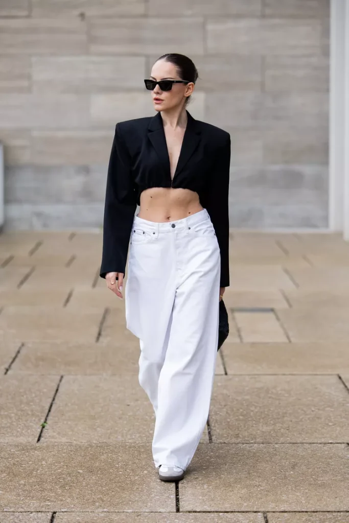 نسقي بليزر أسود قصير مع جينز أبيض واسع، التباين بين الأسود الحاد والجينز الكاجوال يمنح إطلالة متوازنة تناسب حرارة الصيف وتسمح بمرور الهواء بسهولة.