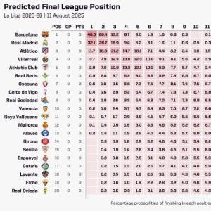 العقبة اليوم – قبل أيام قليلة من انطلاق موسم الدوري الإسباني 2025/2026، كشف الحاسوب الفائق لشركة Opta عن توقعاته، واضعًا فريق برشلونة في صدارة المرشحين للتتويج باللقب بنسبة 46.5% لإعادة الفوز بالبطولة.