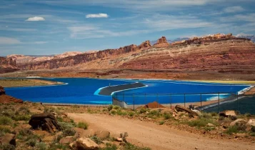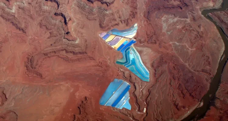 العقبة اليوم – في قلب صحراء يوتا القاحلة في الولايات المتحدة، يظهر مشهد يبدو وكأنه قادم من كوكب آخر: برك تبخير البوتاس الزرقاء الفاقعة التي تلمع وسط الرمال الحمراء وكأنها لوحات ثلاثية الأبعاد مرسومة بالخطأ في الطبيعة. هذه البرك ليست ديكورًا سينمائيًا ولا خدعة بصرية، بل جزء من عملية صناعية لاستخراج الأسمدة الزراعية!