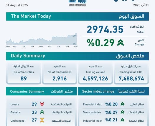 بلغ حجم التداول الإجمالي في بورصة عمان، اليوم الأحد، 7.5 مليون دينار وعدد الأسهم المتداولة 4.6 مليون سهم نفذت من خلال 2916 عقدا.