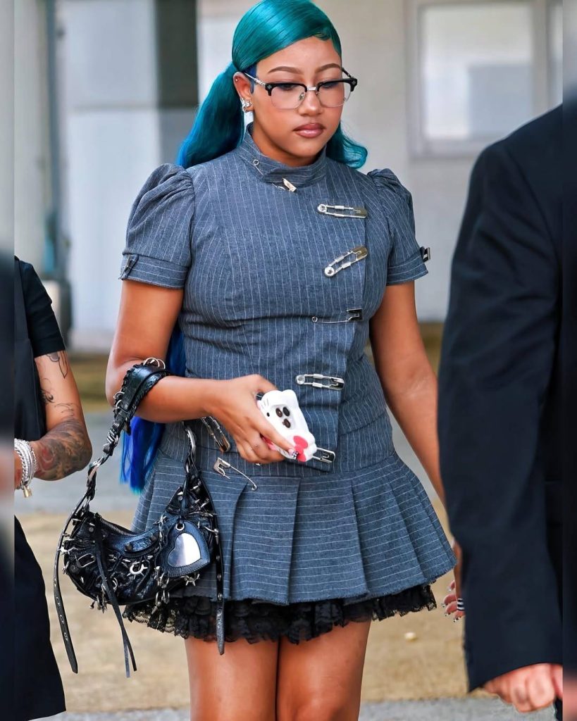 وظهرت ابنة مغني الراب كانييه ويست بعدما كبرت وباتت بملامح مختلفة، وهي ترتدي ملابس ضيقة عبارة عن كورسيه أسود من دون أكمام بتصميم يناسب الكبار مع حركة قبة القميص باللون الأسود، ونسقت معه تنورة قصيرة جداً من الجينز بكشاكش ودانتيل أسود يزين اطرافها.
