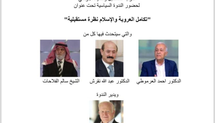 العقبة اليوم- يعقد حزب المستقبل والحياة الارني بمقرة يوم الثلاثاء ندوة سياسية بعنوان “تكامل العروبة والإسلام نظرة مستقبلية”.