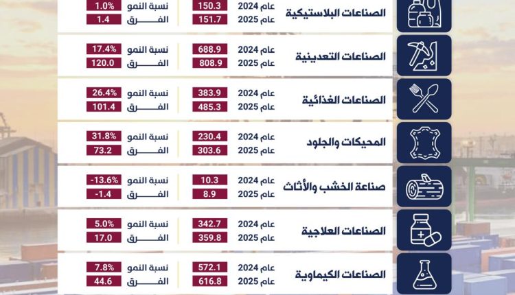 وسجلت 7 قطاعات فرعية زيادة في صادراتها خلال النصف الأول من العام الحالي، بنسب تراوحت بين 1بالمئة للصناعات البلاستيكية والمطاطية، و73.4بالمئة للصناعات الإنشائية.