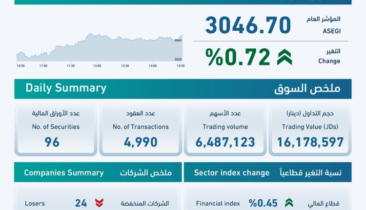 وعن مستويات الأسعار، فقد ارتفع الرقم القياسي العام لأسعار الأسهم لإغلاق هذا اليوم إلى 3046 نقطة، بارتفاع نسبته 0.72 بالمئة.