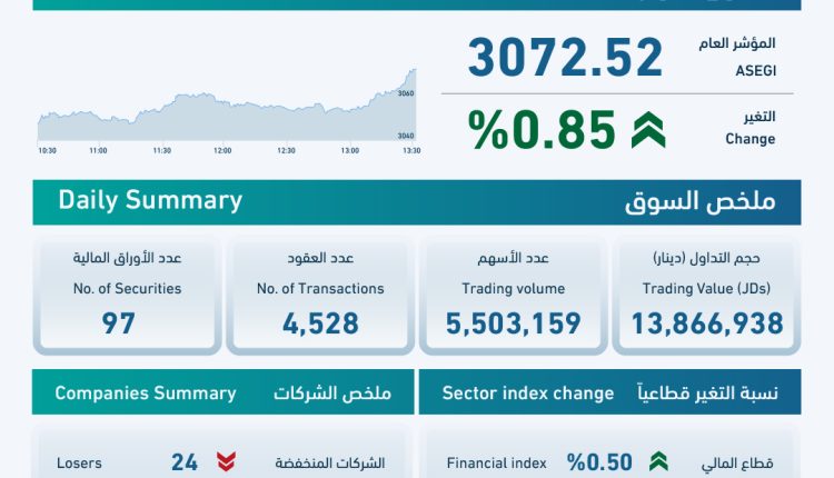 وارتفع الرقم القياسي العام لأسعار الأسهم لإغلاق هذا اليوم إلى 3072 نقطة، بارتفاع نسبته 0.85 بالمئة.